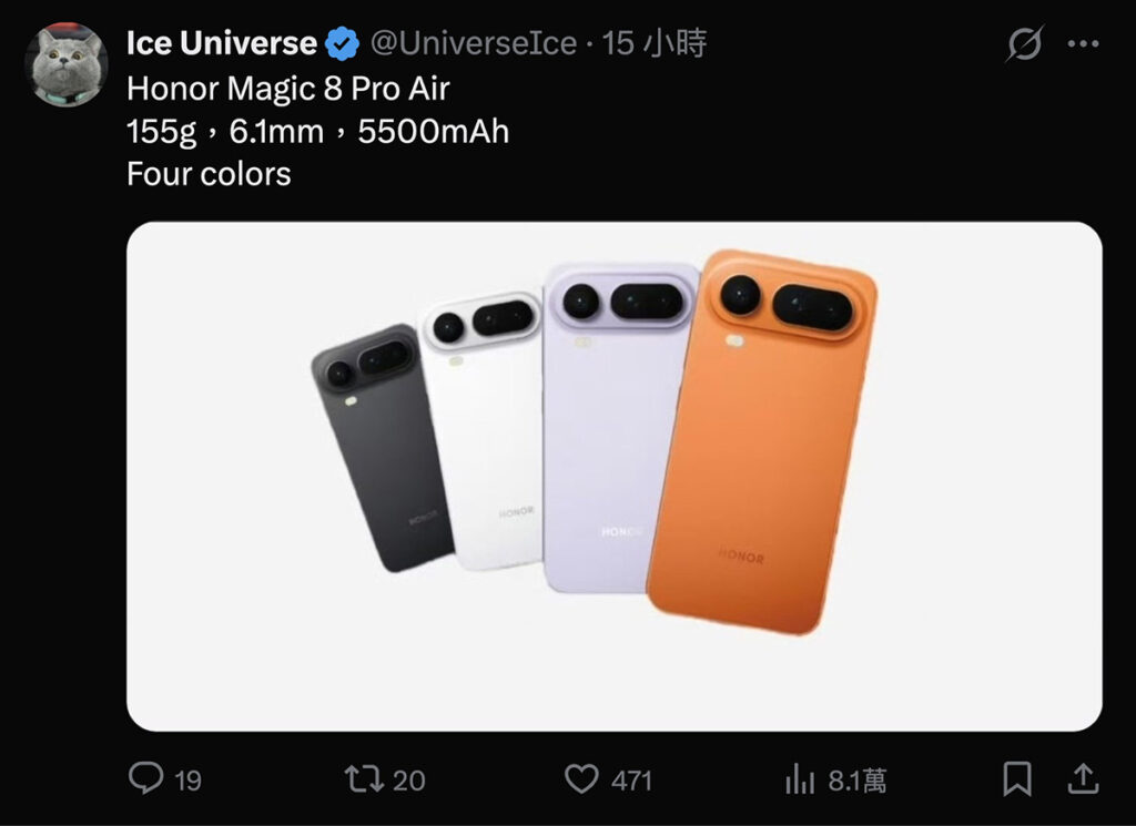 - HONOR Magic8 Pro Air 確認 1 月 19 發佈!傳具四色機身選擇、「這規格」或輕薄機最強?