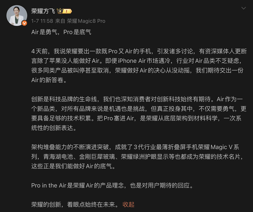 而日前暗示裝置發佈的 HONOR 產品線總裁方飛,後續亦在微博帳號回應指,品牌有製作三代業界最薄摺屏 Magic V 系列經驗,「將 Pro 塞進 Air」技術底氣十足。