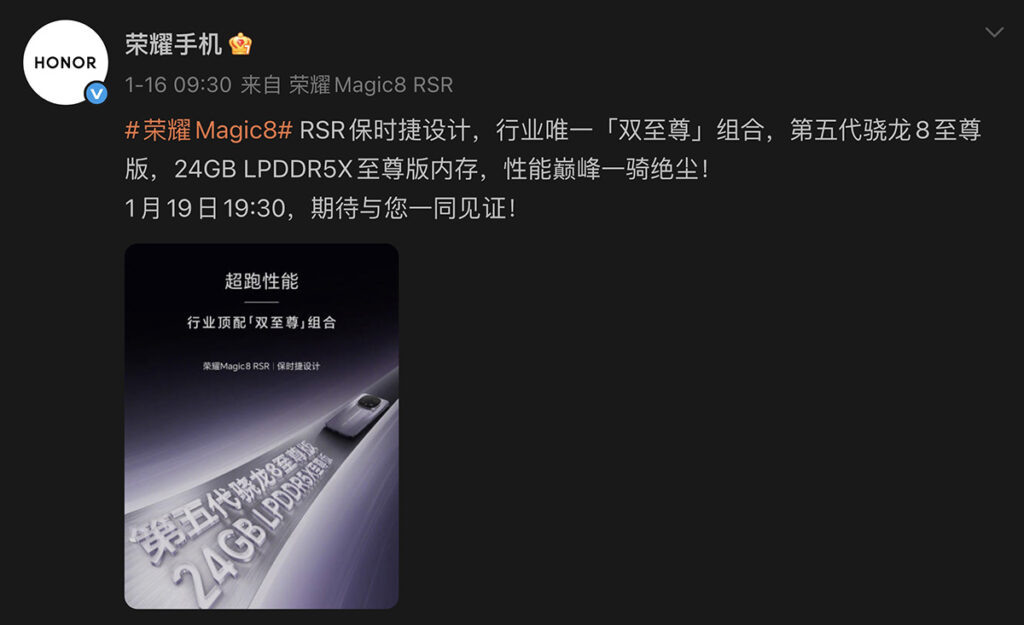據 HONOR 在「榮耀手機」官方微博帳號公佈資訊,HONOR Magic8 RSR 保時捷版確認採用 S8E Gen5 晶片,同時頂配機型會提供 24GB LPDDR5X 記憶體配置。