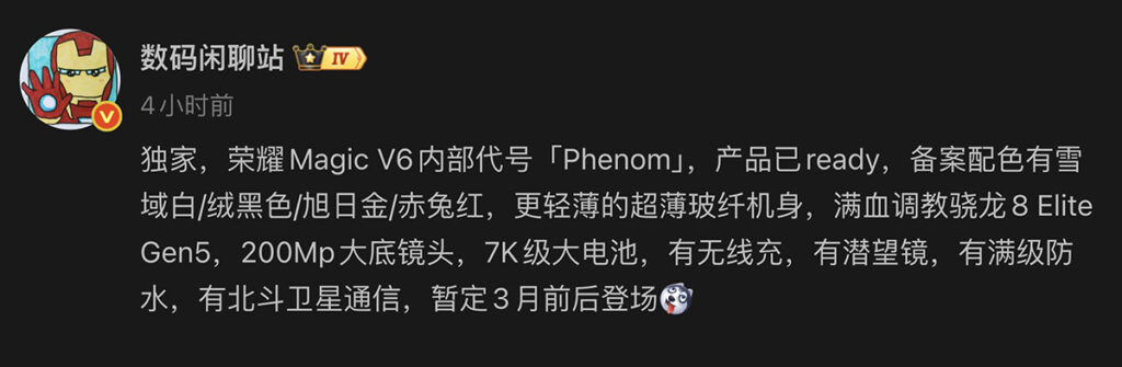 關於 HONOR Magic V6 核心配置資訊,由爆料達人「數碼閒聊站」早前在其微博帳號透露,消息指內部代號為 Phenom 的 Magic V6 手機,最快或 3 月左右推出。