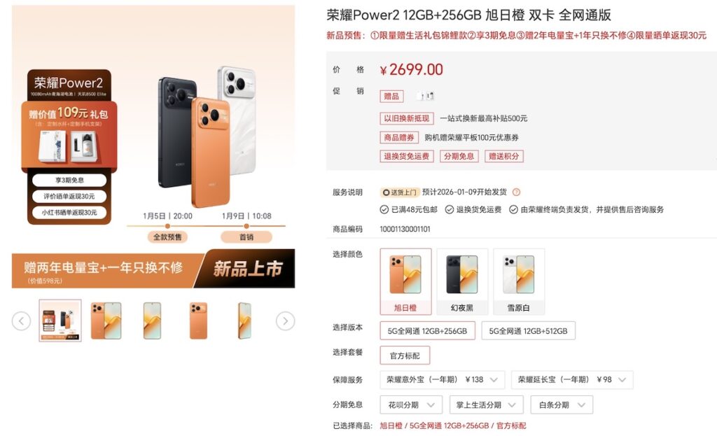 國內 HONOR Power2 預計 1 月 9 正式出貨,具旭日橙、幻夜黑及雪原白三色款、12+256 跟 12+512 雙配置,售 2,699 人民幣(約港幣 $3,010)起。