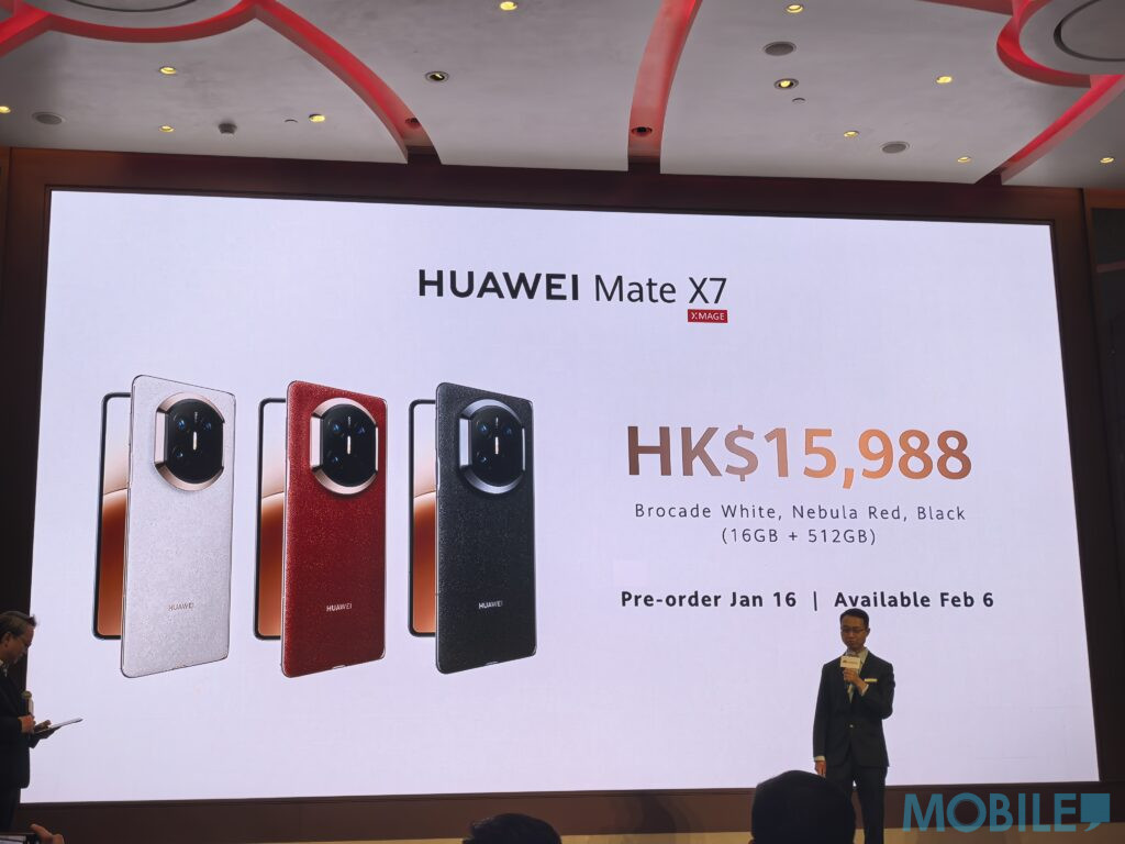 HUAWEI Mate X7 備有雲錦白、寰宇红及曜石黑配色,提供 16GB + 512GB 版本,建議零售價為$15,988。 由2026 年1 月16 日起於指定零售商接受預訂,並將於 2026年2月6 日正式發售;指定零售商包括HUAWEI 香港網上商店(consumer.huawei.com/hk/offer/)、HUAWEI 沙田新城市廣場體驗店、HUAWEI 九龍灣德福廣場體驗店、3HK、3SUPREME、SmarTone、中國移動香港、中國電信澳門、澳門電訊、百老滙、豐澤、蘇寧、衛訊、中原電器、CMK及HKTVmall 授權專賣店。