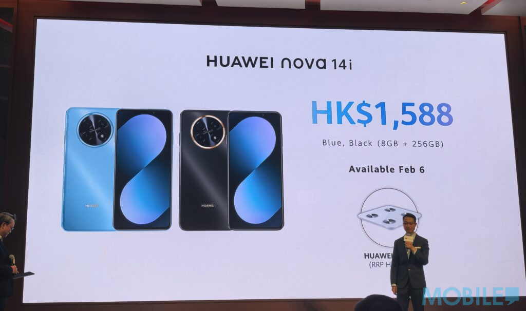 HUAWEI nova 14i 備有藍色及黑色配色,提供8GB + 256GB版本,建議零售價為$1,588, 將於2026 年2 月6 日正式發售;有關銷售詳情請留意官方專頁公佈。