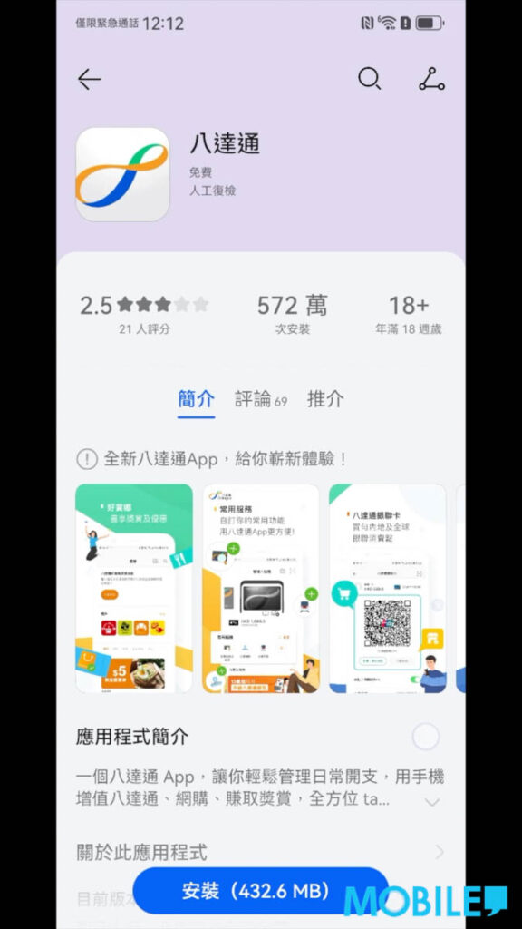 ▲ 經 AppGallery 下載《八達通》App