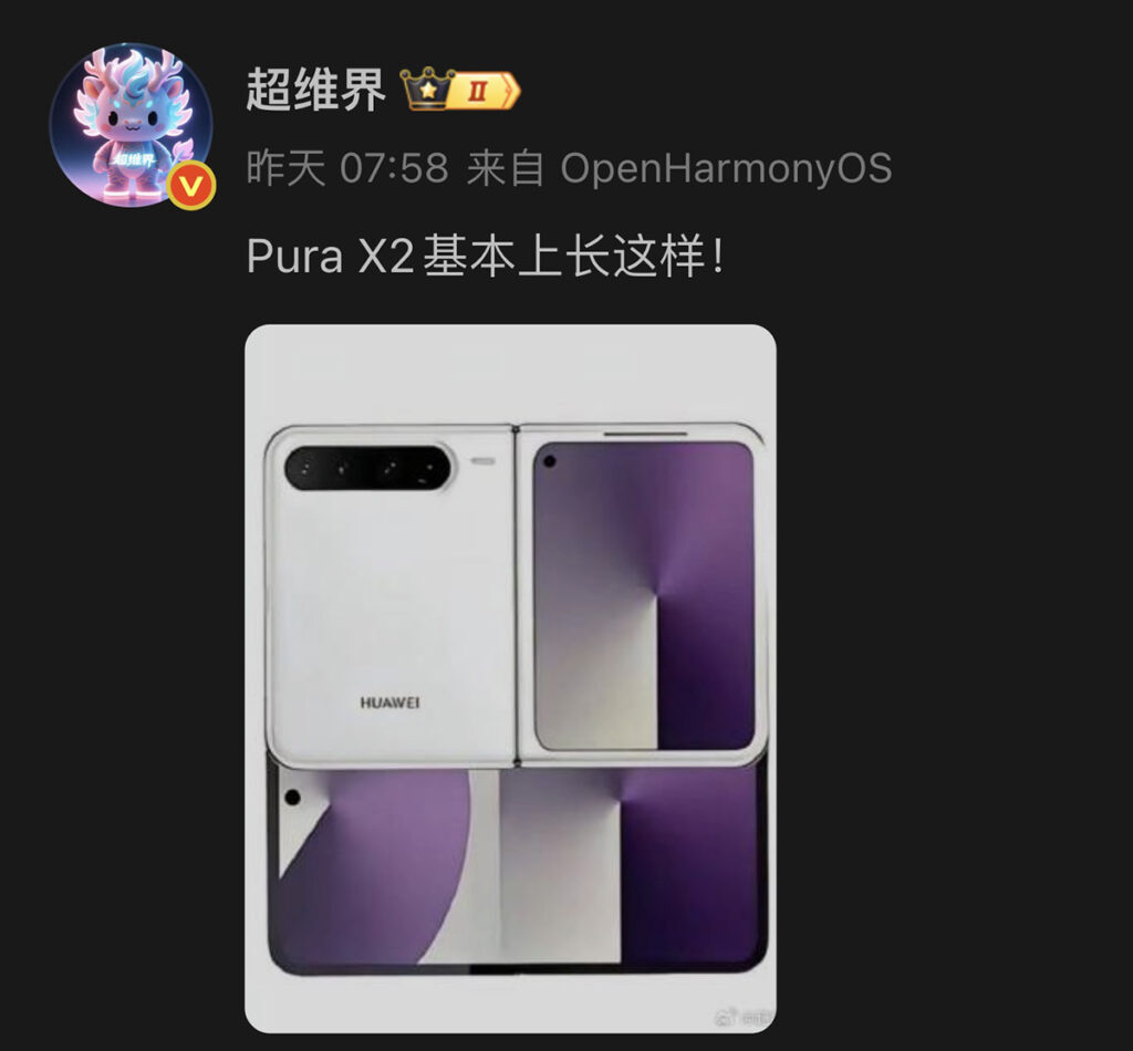 較早前數碼博主「超維界」在微博帳號透露,HUAWEI Pura X2 將在硬件級別作出升級,由前代揭蓋式細摺設計、化身為具 7.5x 吋主屏、16:10 比例大摺裝置。