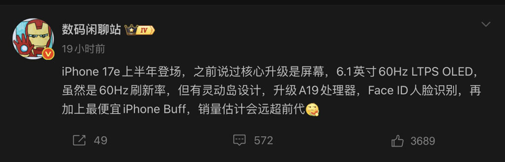 據爆料達人「數碼閒聊站」在微博透露資訊,iPhone 17e 畫面升級將為裝置主要賣點,其雖保持 60Hz 更新率,但就換上 6.1 吋 LTPS OLED 動態島螢幕。