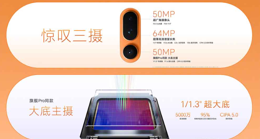 機背的相機模組設計獨特,融合圓形與藥丸形狀,並容納了三枚後置鏡頭,配置上比僅有單鏡頭的 iPhone Air 更為進取。模組橫向排列於機身上方,形成一道由左至右延伸的飾帶。機身側面新增一顆實體「AI 按鍵」,用戶可自定義其功能,例如快速調整相機變焦、控制相簿瀏覽等,提升操作效率。