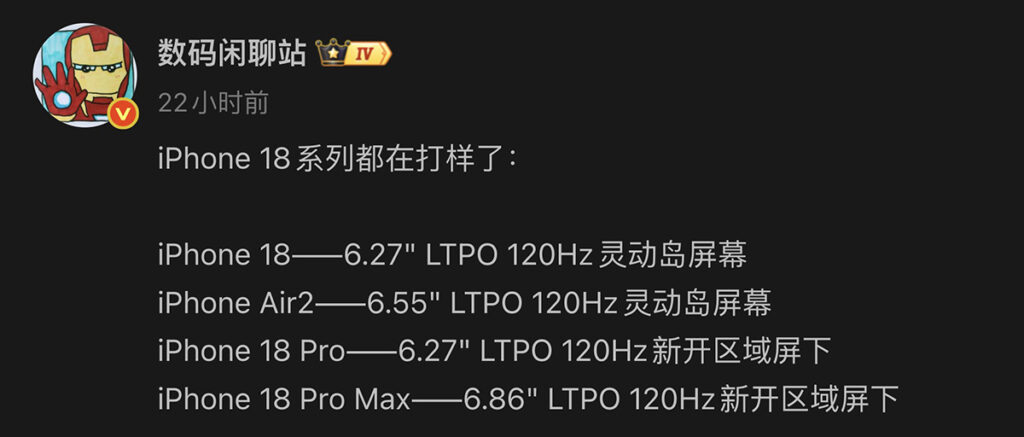 據爆料達人「數碼閒聊站」在微博帳號透露,iPhone 18 / Air2 / 18 Pro 跟 Pro Max 四機,已進入實機樣本試產環節,預計全系列將具 LTPO 120Hz 更新率規格。