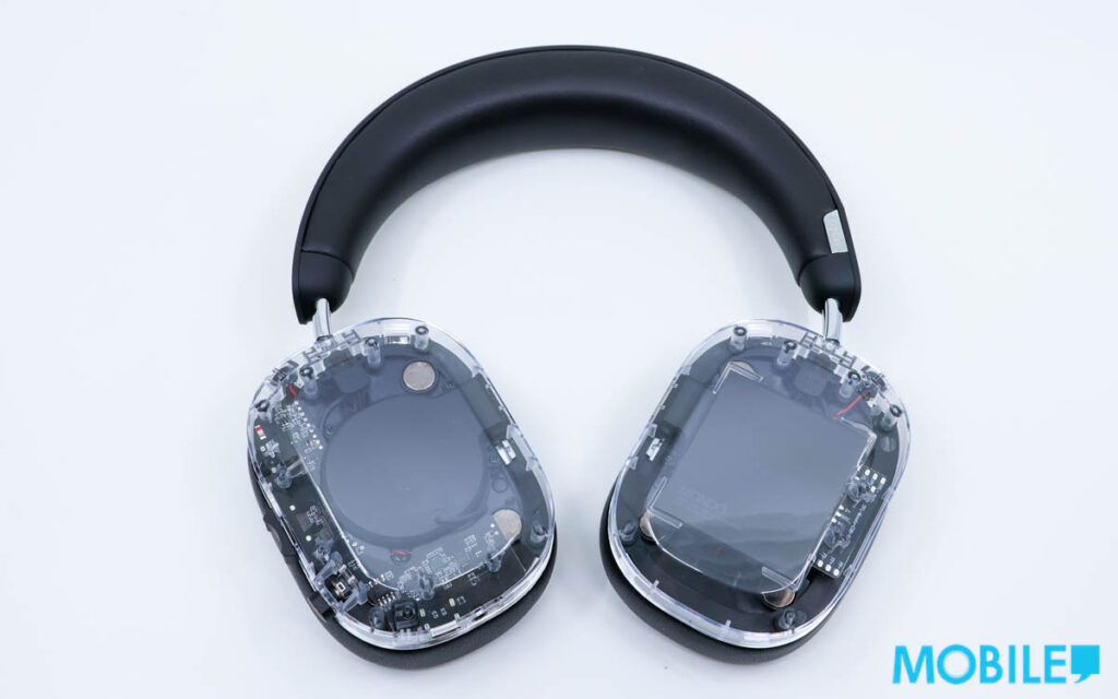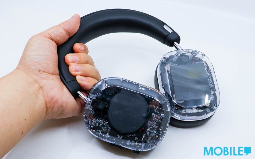 雖 MONDO ANC Headphones 耳機外觀主打 80’s 復古設計,不過可看到內部零件透明款就更重電子感,新品開箱頭樑臂位較為實淨,調整耳罩位置需較用力。