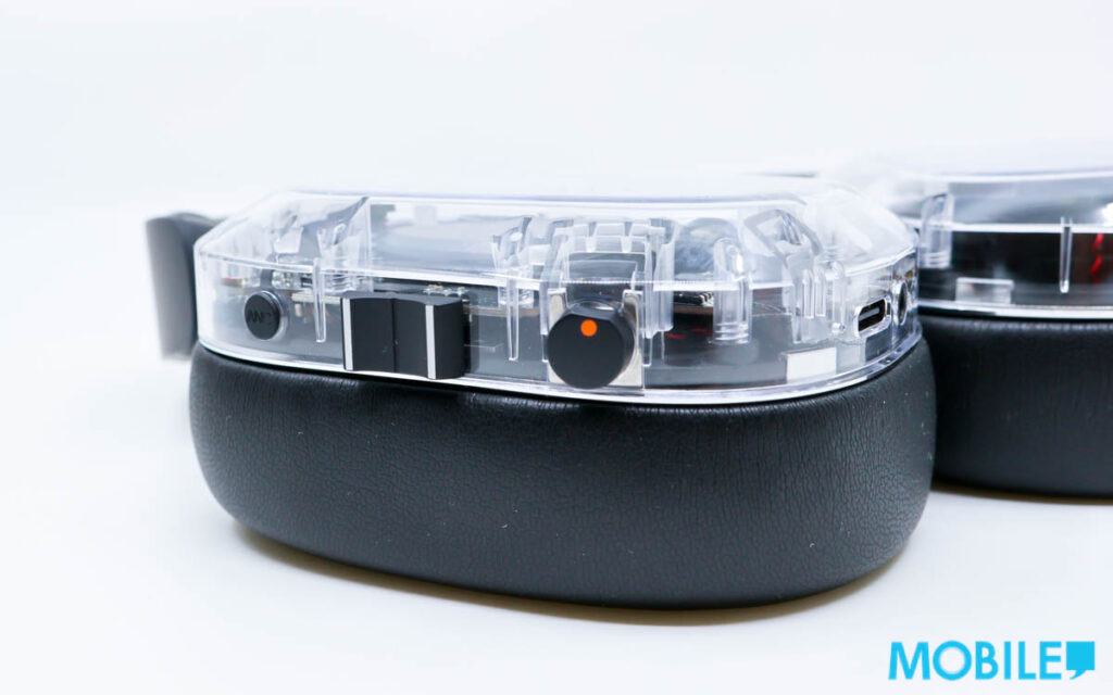 採用耳罩設計的 MONDO ANC Headphones 耳機,半透明款配上皮革物料耳罩,佩戴時包覆感明顯;耳機實體鍵體積相當大,方便同時仿類比旋鈕操作亦頗易上手。