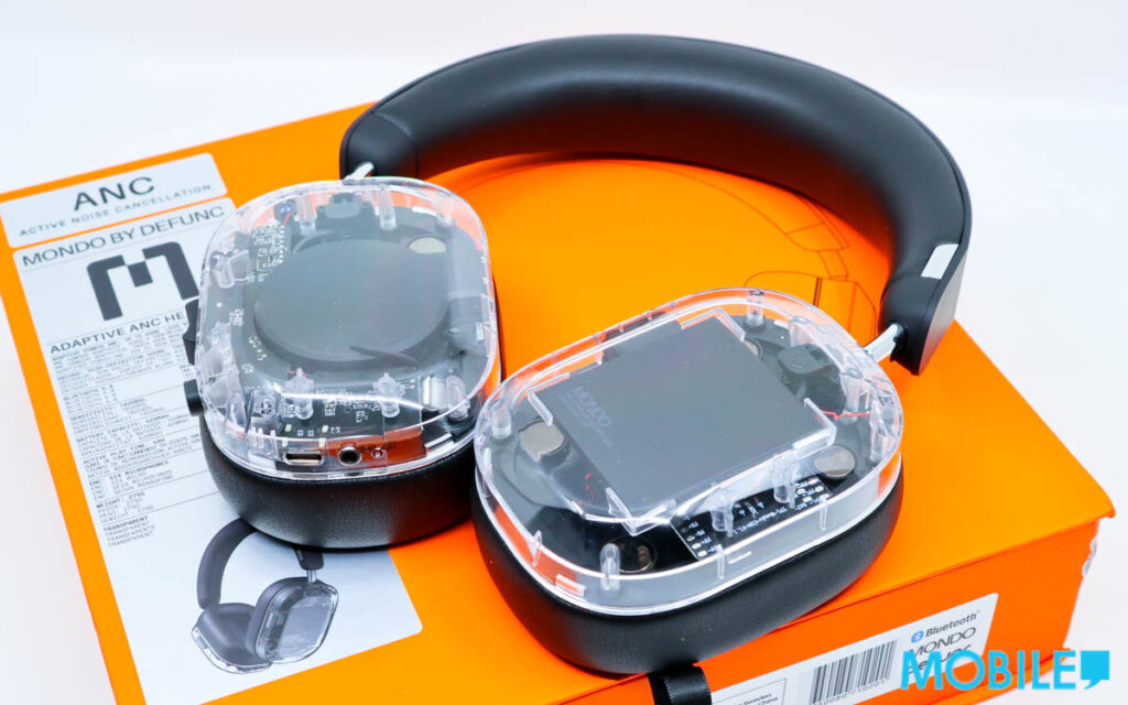 開箱透明款 MONDO ANC Headphones 耳機,搶眼橙色大盒包裝列出耳機主要配置,內容物跟齊耳機袋、仿古 3.5mm 「電話線」、USB-C 可接駁內置 DAC 晶片。