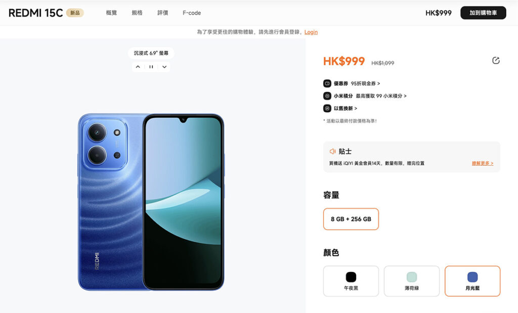 本文刊登時 REDMI 15C 已在小米香港官方網店上架,港版具備午夜黑、薄荷綠及月光藍色款選擇,統一提供 8+256 配置,現以 $999 價格開賣(原價 $1,099)。