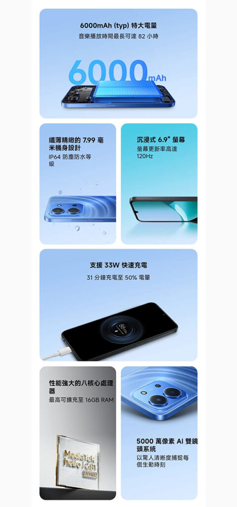 規格部份 REDMI 15C 配備 Helio G81-Ultra 晶片,6.9 吋 HD+ 屏幕;機身支援 8GB 虛擬記憶體、對應 MicroSD 擴充,鏡頭部份則配備 50MP 雙鏡。
