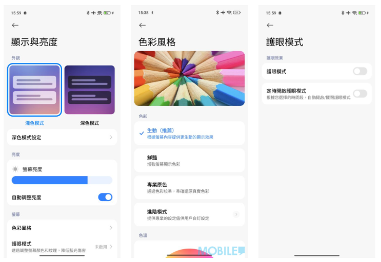 ▲ 提供深色模式、護眼模式及自適應色彩模式設定