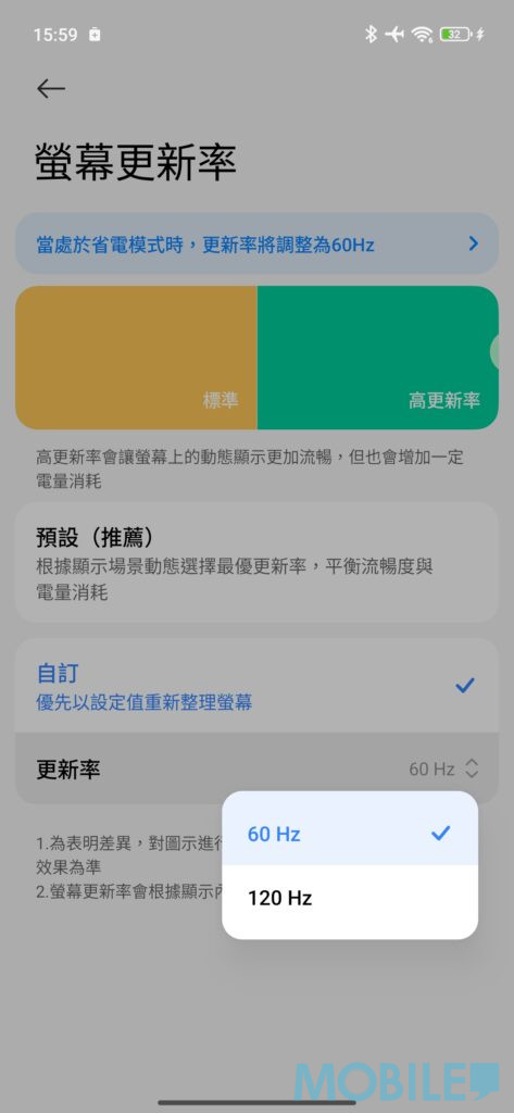 ▲屏幕設定內可自行設定 120Hz 及 60Hz 更新率。