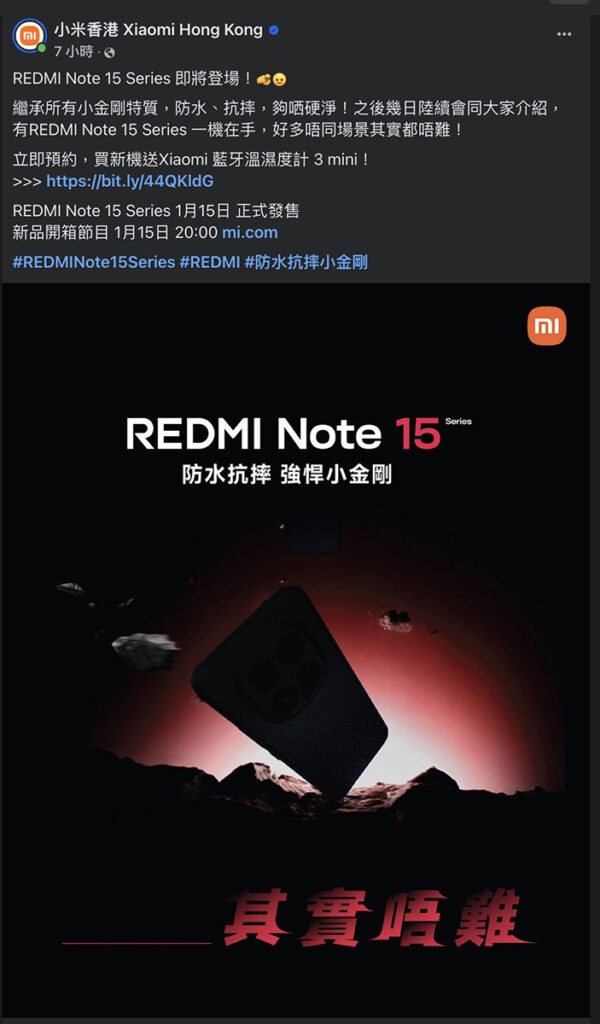 據小米香港 Facebook 專頁資訊,預計 1 月 15 發佈兼同日開賣的 REDMI Note 15 Series 手機,將以防水抗揮耐用機身作為主要賣點,現時未確認港版機型。