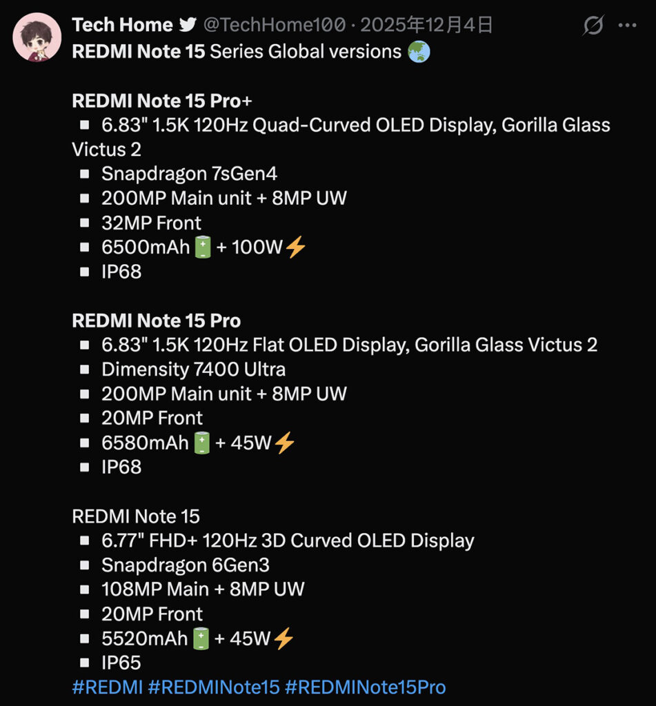 機身規格方面,早在上月網絡已有 REDMI Note 15、Pro 跟 Pro+ 三版本機型配置流傳,其中 Pro 及 Pro+ 版均具 200MP 主鏡,Pro+ 版將配 7s Gen4 晶片。