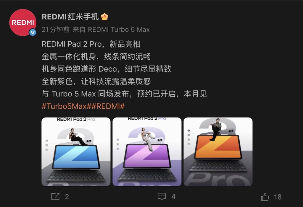 另一篇官方博文則透露 REDMI Pad 2 Pro 將具全新紫色、深灰色及銀色機身可選,並透露平板機身將採用金屬一體化技術製成,可預期有更耐用表現。