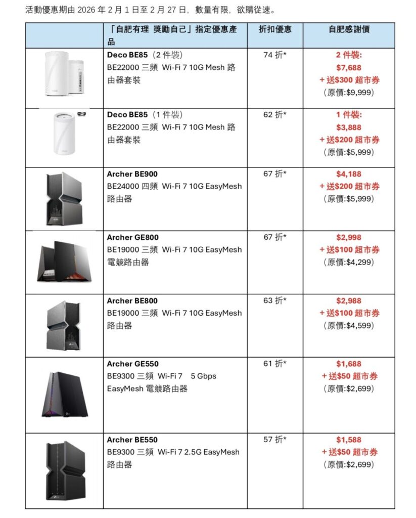 踏入2026年新開始,TP-Link 特別為香港用家帶來「自肥有理」新春獎勵計劃 。由 2月1 日起至 2月27 日期間,多款旗艦級及主流 Wi-Fi 7 路由器將以「自肥感謝價」發售,涵蓋 Deco 系列及 Archer系列,助用家趁農曆新年親友拜年之際,全面升級家居網絡,享受極速上網體驗 。