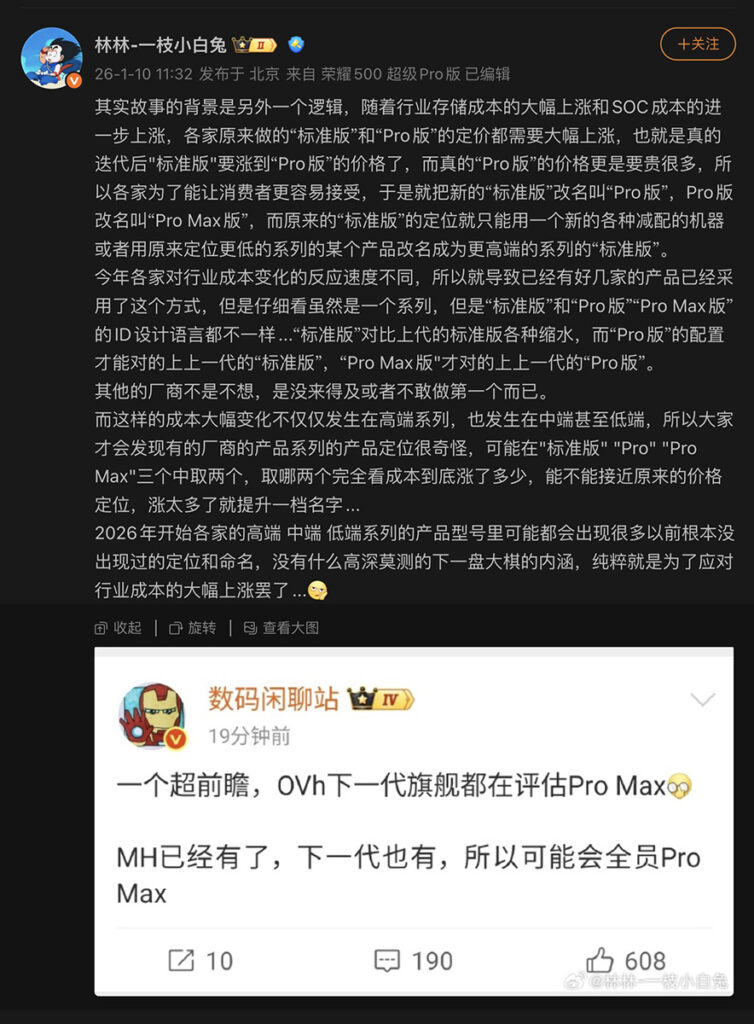 其回應指大幅度採用 Pro 版跟 Pro Max 版本至手機型號做法,主要是因為重要零件如 SoC 跟 RAM、儲存成本大幅度上漲,必需採用更易讓用家清楚了解的定名方式。