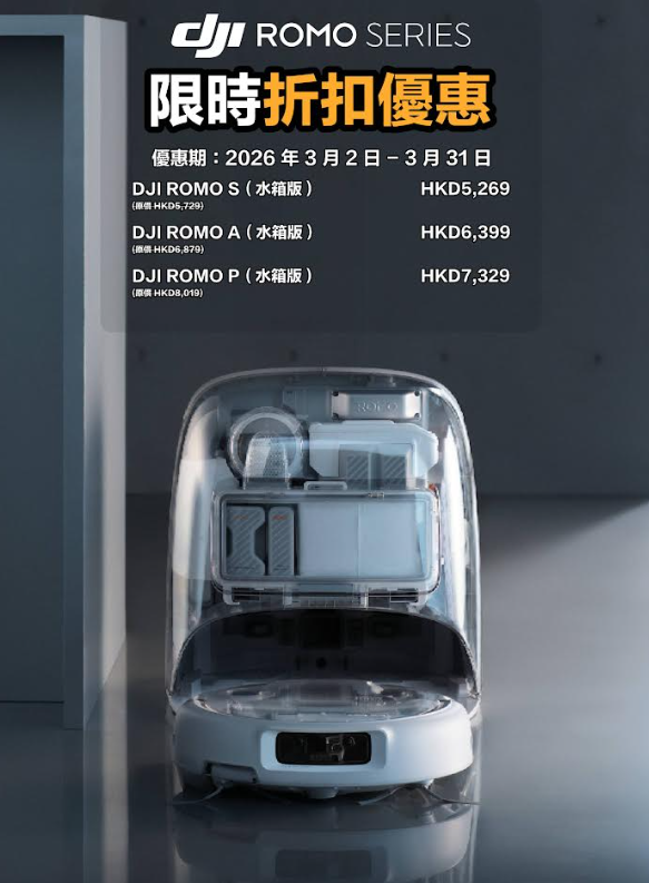 DJI 首代掃地機械人 ROMO 系列正式進駐香港,將無人機級感知技術引入家居。系列推出簡約白的 ROMO S、半透明機身的 ROMO A 及全透明旗艦款 ROMO P。即日起至 3 月 1 日展開預售優惠,3 月 2 日正式開賣。