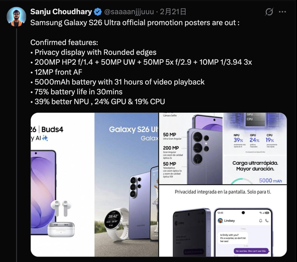 消息人 @saaaanjjjuuu 在 X 帳號展示疑似 Galaxy S26 Series 官方宣傳物料,當中可看到 S26 Ultra、S26+ 手機、跟 Buds4 與 Buds4 Pro 耳機外觀。