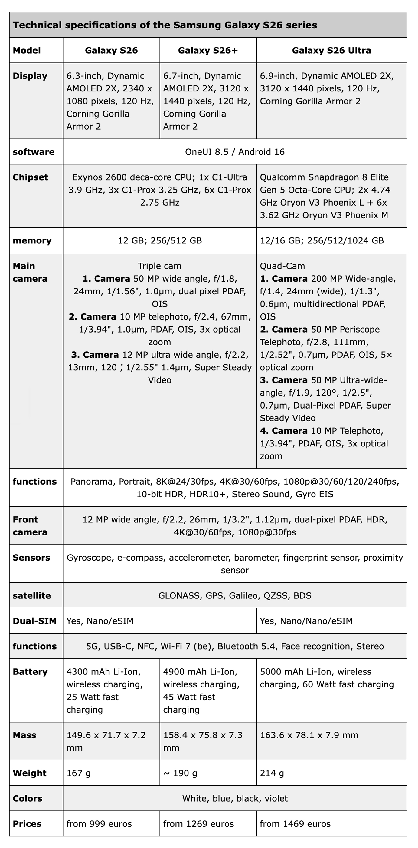 關於 S26 系列三款新品詳細規格資訊,由德媒 WinFuture 在較早時份於網絡展示,據透露這次披露詳細規格主要適用於歐洲市場,其他地區如港版或有所差異。