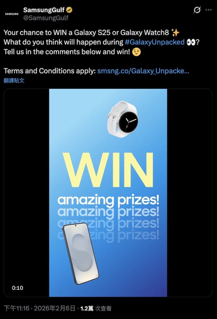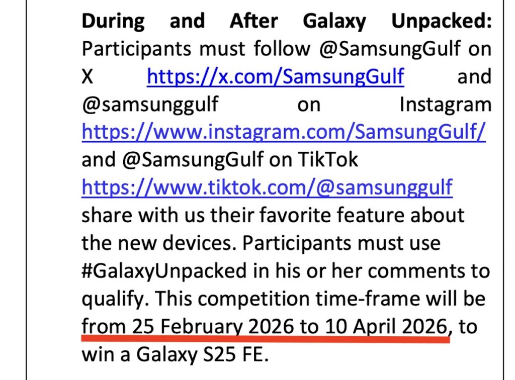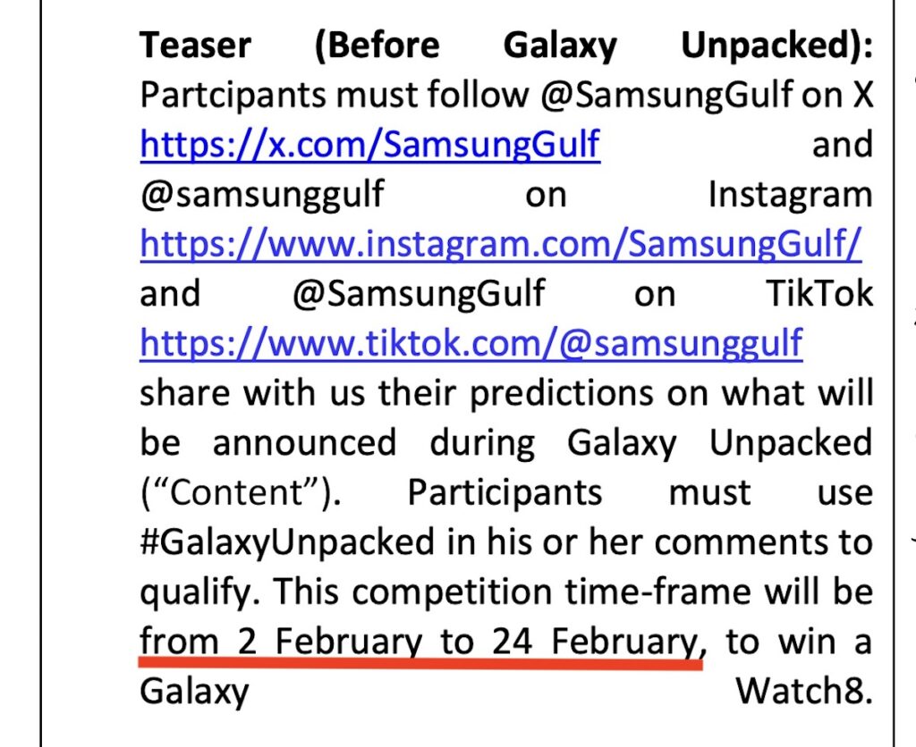 不過早前 Samsung Gulf 海灣區舉辦 Galaxy Unpacked 預熱活動,其於官方 X 帳號(@SamsungGulf)上傳、關於該活動條件細則的 PDF 檔、就意外揭示發佈會日期。