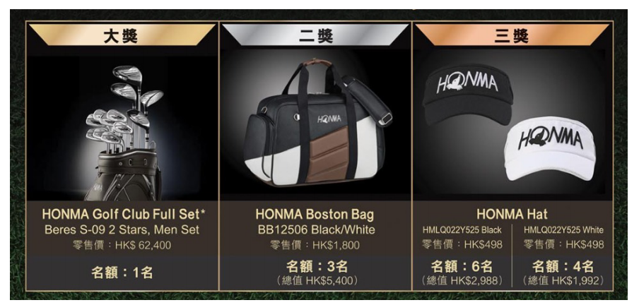 為回饋支持限量版的客戶,由即日起至 2026 年 4 月 30 日,凡購買香港原廠行貨並於活動網頁完成登記,即可參加抽獎,獎品總值超過港幣 $70,000 。大獎名額 1 位,可獲得價值港幣 $62,400 的 HONMA Beres S-09 2 Stars 男子高爾夫球桿套裝 。二獎及三獎則分別提供 HONMA 波士頓包(共 3 名)及 HONMA 運動帽(共 10 名)。