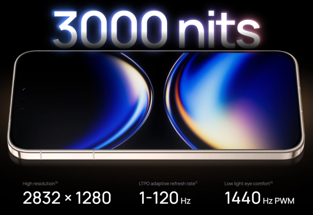 HUAWEI Mate 80 Pro 螢幕表現方面,搭載了一塊 6.75 吋的 OLED 面板,支援 1-120Hz LTPO 自適應刷新率以及高頻 PWM 調光技術。螢幕四角採用微曲設計,配合極窄邊框,令正面視覺感觀接近全屏,手感亦更加圓潤。此外,前置相機區域由 1300 萬像超廣角鏡頭與 3D 深感鏡頭組成,確保了支付級的面容解鎖安全性。