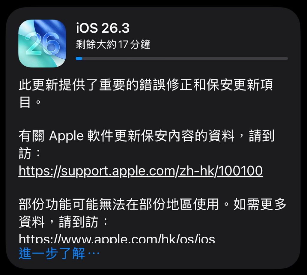 本文刊登時在港用家已能接收 iOS 26.3 / iPadOS 26.3 版本更新通知,為支援 iPhone 及 iPad 進行升級,升級內容主要為錯誤修正及保安更新項目。
