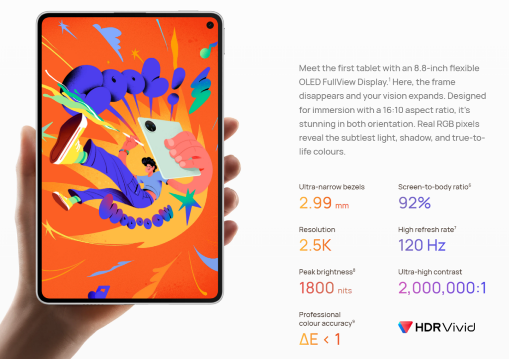 HUAWEI MatePad Mini 機身搭載一塊 8.8 吋的柔性 OLED 全螢幕 (2560 x 1600)。除了支援 120Hz 高更新率與 1800 nits 峰值亮度外,今次更將PaperMatte 技術引入其中。這項技術透過納米磁控光學鍍膜與創新光學薄膜材料,能大幅降低螢幕反光與閃爍干擾,提供接近紙張的柔和光澤,對於長時間閱讀或書寫的用戶來講,護眼效果顯著提升。