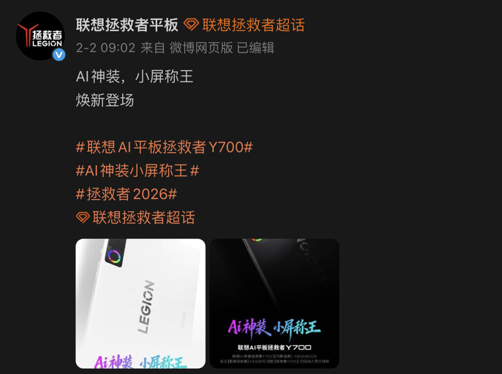 本文刊登時 LENOVO「聯想拯救者平板」官方微博帳號,已確認推出拯救者 Y700 五代平板並開始先行預熱,流出部份機背外觀與前代相近,並同具黑白雙色款選擇。