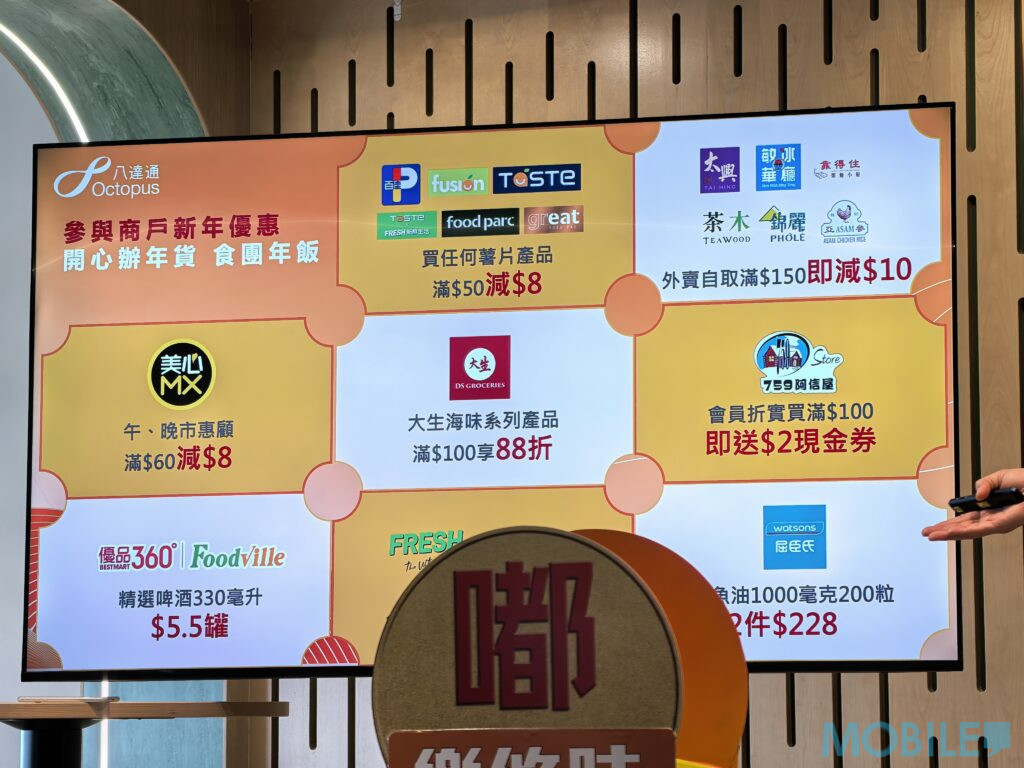 除了核心的抽獎活動,八達通亦聯同全港 29 個零售及餐飲品牌,由 2 月 3 日至 2 月 28 日期間推出多項限定購物優惠 。當中包括在美心 MX 午市或晚市消費滿 60 元即可減 8 元,以及在太興集團旗下指定餐廳如太興、敏華冰廳、茶木等外賣自取滿 150 元減 10 元的禮遇 。對於需要辦年貨的市民,在大生生活超市購買指定海味系列滿 100 元亦可享 88 折優惠,涵蓋範圍從日常餐飲到過年聚會所需 。
