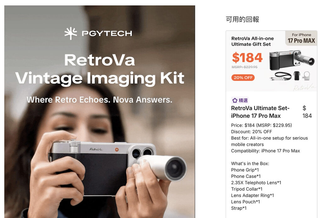PGYTECH 製作 RetroVa 外接鏡頭套裝專為 iPhone 17 Pro / Pro Max 及 16 Pro / Pro Max 而設計,未來將往後推出兼容 iPhone 18 Pro 系列版本。