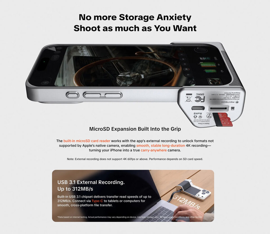 PGYTECH RetroVa 更內置 MicroSD 記憶卡擴充,無需擔心內置儲存不足;同時保護殻亦具 USB 3.1 標準 Type C 埠,可以達 312MB/s 高速傳輸數據。