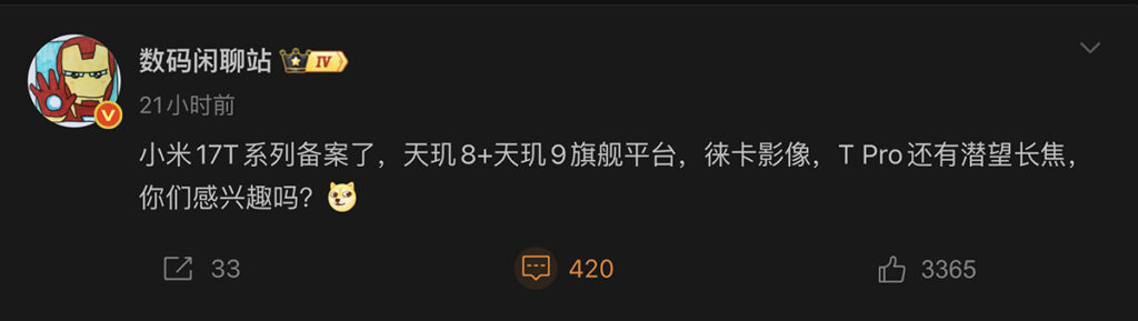- Xiaomi 17T 盛傳已正式備案!全線續具 LEICA 鏡頭、頂配天璣 9500 晶片,或較前代早 4 個月面世?