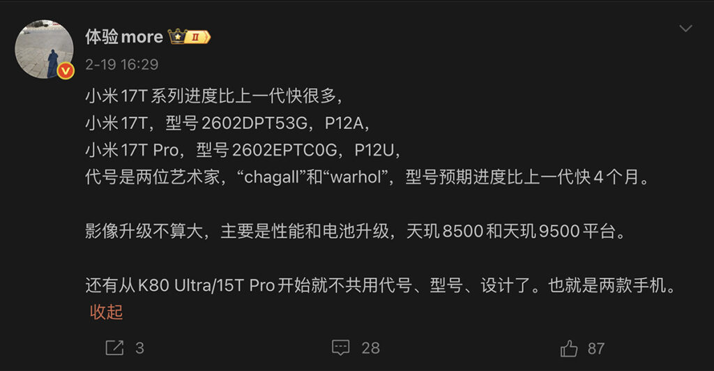 稍早前數碼博主「體驗more」曾提到,Xiaomi 17T 雙機開發進程,或較前代 15T 系列快上 4 個月,主要改動在電池及效能提升,獨立設計不再衍生自其他機型。