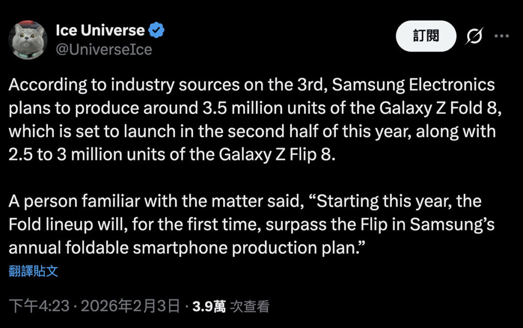 爆料達人 Ice Universe 早前在 X 帳號透露,供應鏈傳出三星欲調整今年 Z Fold8 出貨量,首輪生產或增至 350 萬部,預計今年下半年推出市場。