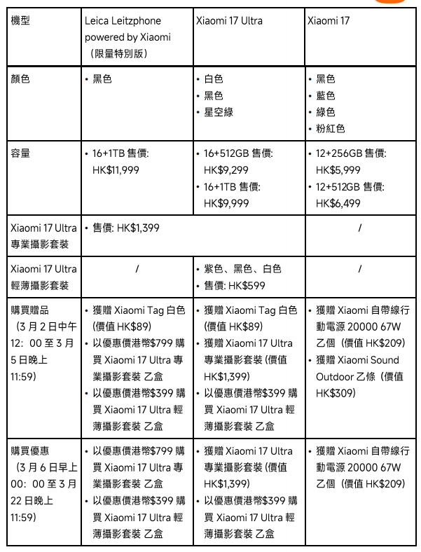 Xiaomi 17 系列將於 3 月 2 日中午 12 時起接受預訂,3 月 6 日正式開售。Xiaomi 17 建議零售價由 $5,999 起(12+256GB);Xiaomi 17 Ultra 建議零售價由 $9,299 起(16+512GB);而限量版 Leica Leitzphone 售價為 $11,999 (16+1TB)。