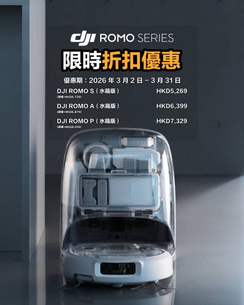 最令市場驚喜的於生活家電線的 DJI ROMO 系列。這款新推出的掃地機器人共有 P(水箱版)、A 及 S 三個版本,在 3 月推廣期內均可享數百港元的折扣,最高階的 ROMO P 水箱版優惠價為 $7,329 。無論是想升級拍攝裝備,還是希望透過新科技改善家居清潔效率的用家,都不應錯過這場截至 3 月底的優惠 。