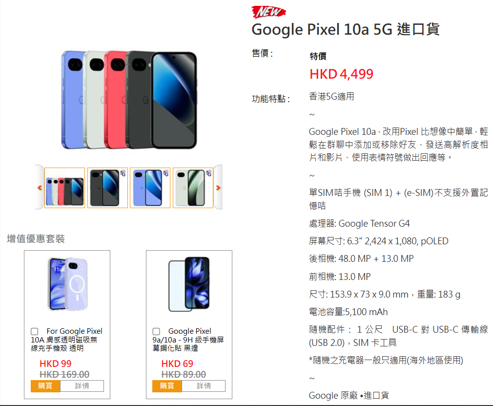 ▲現時 Pixel 10a (256GB)定價為 $4,499,並提供紫、粉紅及黑四色。(查詢:citylink)