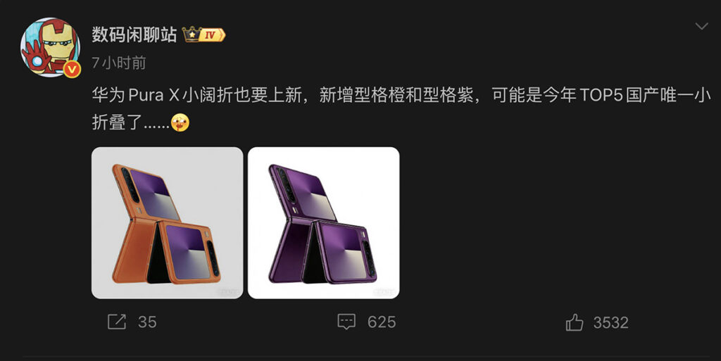 據爆料達人「數碼閒聊站」透露,HUAWEI 將為揭蓋式闊屏細摺 Pura X 手機,推出全新型格橙及型格紫色款,其亦可能為今年國產大廠獨一份細摺手機新品。