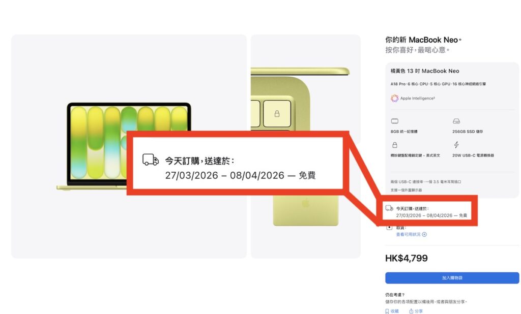 本文刊登時 Apple 香港官方網店資訊,出機各色款 MacBook Neo 均需「排隊」,以 256GB 橘黃色款為例,最快出貨要等 3 月 27 至 4 月 8 日間。