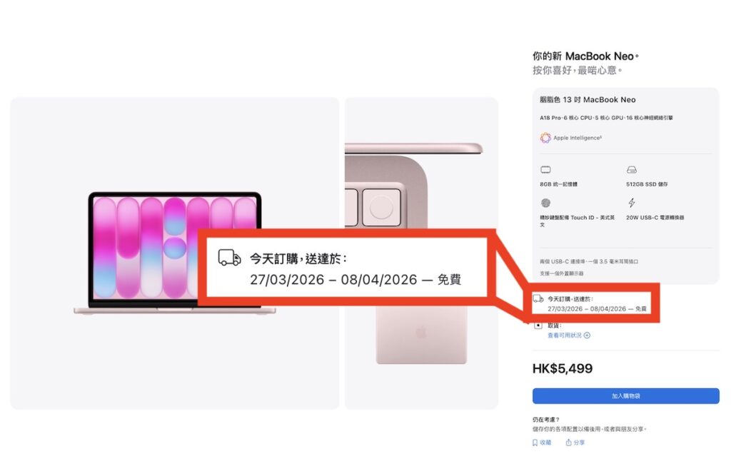 而高配 512GB 加 Touch ID 鍵盤 MacBook 機型,以胭脂色款為例,點擊購買排期同樣要等最快 3 月 27 至 4 月 8 日檔期,熱搶程度堪比 iPhone 17 Pro。