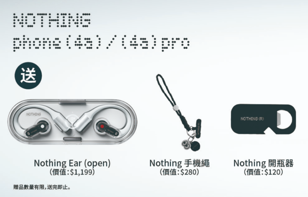 為了回饋首批支持者,凡購買 Phone (4a) 系列手機的用戶,將有機會獲得總值超過 $1,500 的限定贈品。禮遇包括價值 $1,199 的 Nothing Ear (open) 開放式耳機、價值 $280 元的 Nothing 手機繩以及價值 $120 的 Nothing 開瓶器。所有禮品數量有限,送完即止。