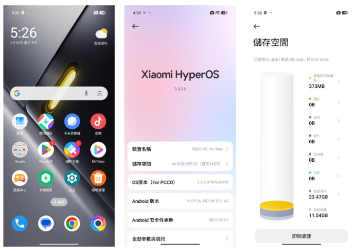 ▲港版 POCO X8 PRO MAX 預載 HyperOS 3.0 系統,512GB 機型啟動後約佔用 35.4GB 空間。