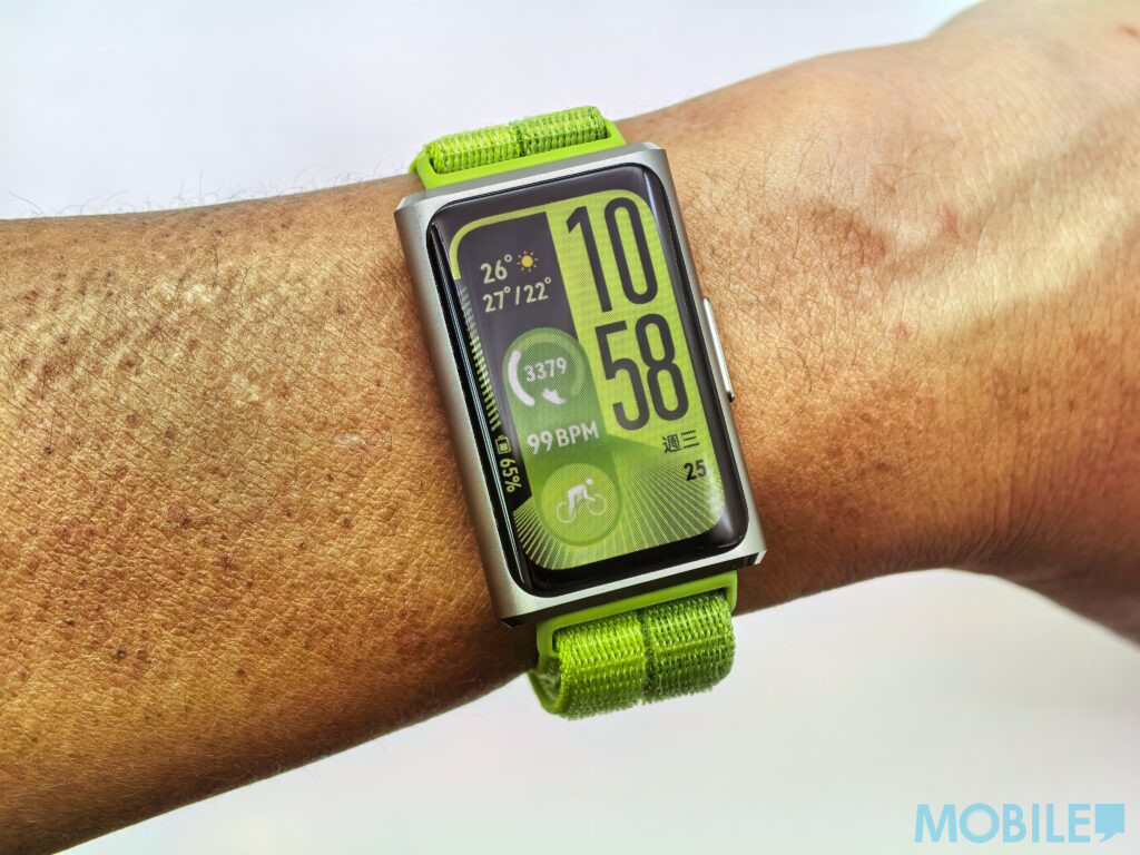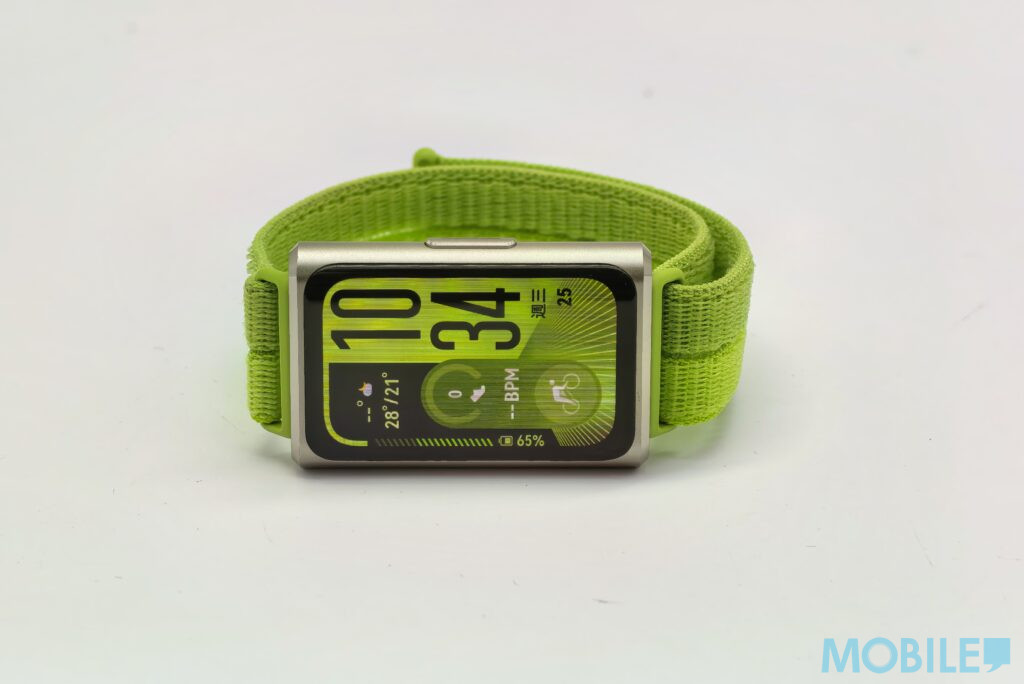 與過往 Band 系列常見的塑料材質不同,HUAWEI Band 11 Pro 首次採用了 CNC 工藝切割的鋁合金中框,配以精緻的倒角設計,整體視覺與觸感顯得更為高級。機身厚度維持在 8.99mm,不含錶帶的重量僅為 18g,戴在手上幾乎沒有負擔,即便是睡眠時配戴也相當舒適。