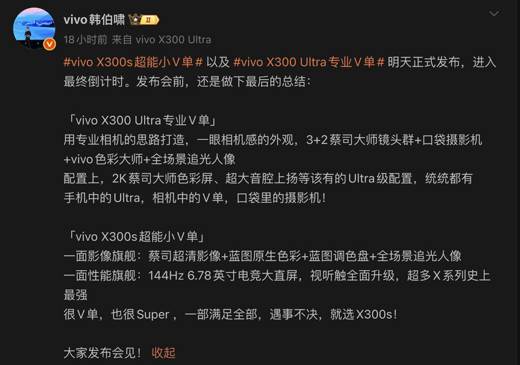 較早前 vivo 產品經理韓伯嘯就透過微博帳號,率先披露頂配機型 vivo X300 Ultra 的詳細配置資訊,包括各項拍攝規格、跟硬件方面完整參數。