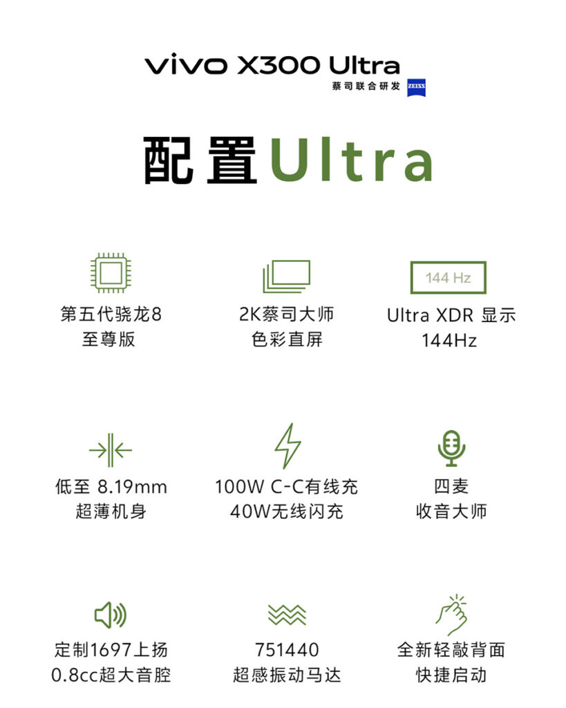 硬件方面 vivo X300 Ultra 採用 S8E Gen5 晶片、2K 144Hz 蔡司大師色彩直屏,支援 100W / 40W 充電,機身厚度最薄端僅 8.19mm,並加強內置揚聲器表現。